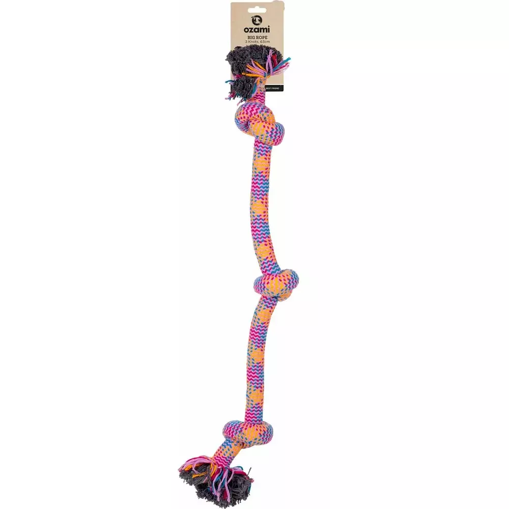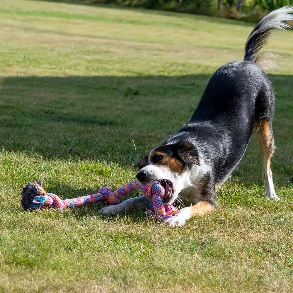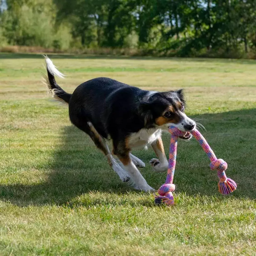 Et fargerikt og slitesterkt tau med flere knuter, perfekt for tautrekking, apport og tyggeleker.